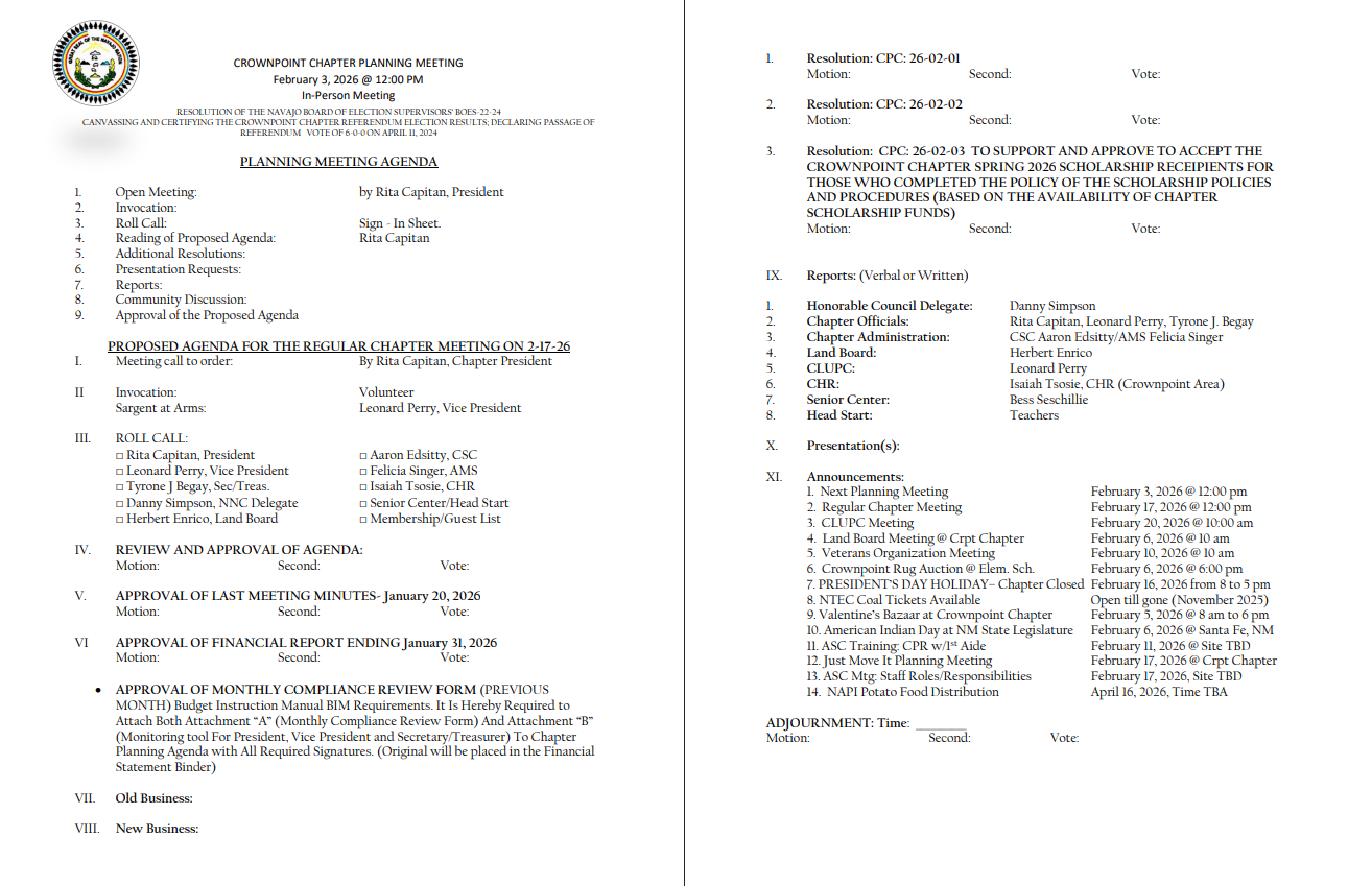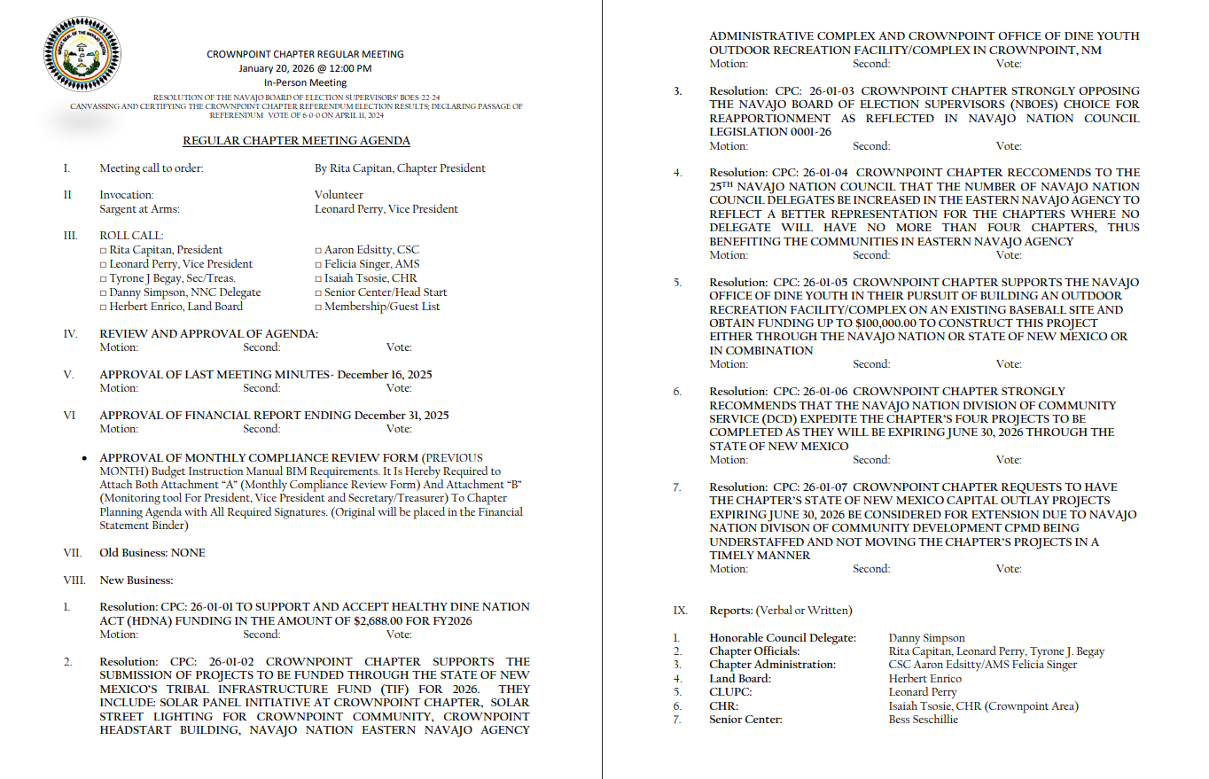 The Crownpoint Chapter of the Navajo Nation will be closed on